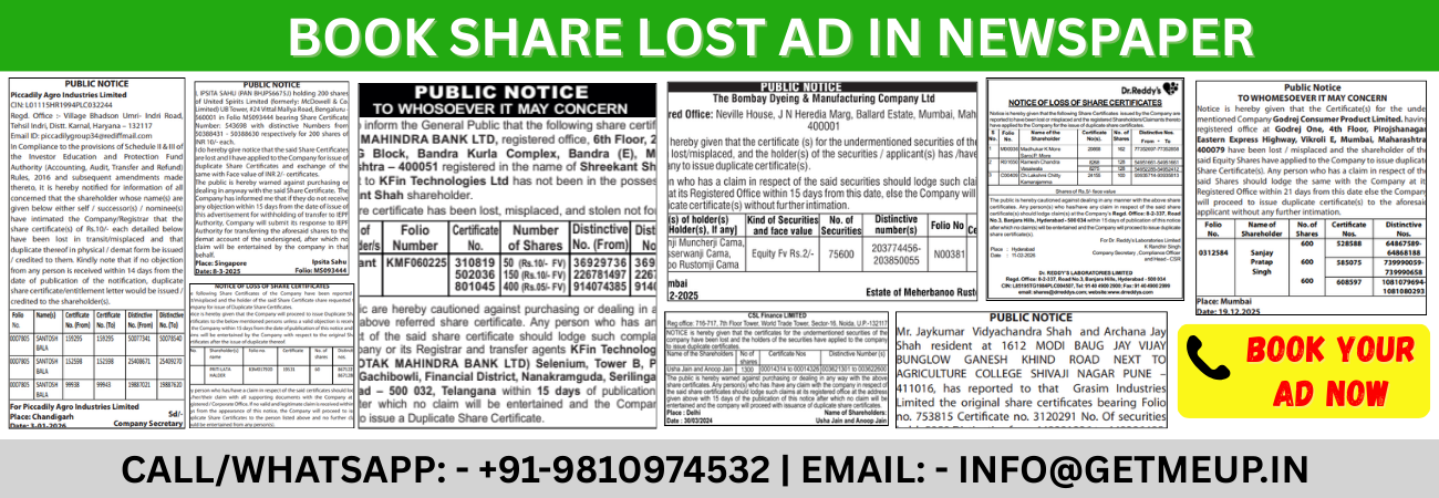 Looking to Book Share Lost Notice Newspaper Ad for lost or misplaced share certificates? Get Me Up Advertising helps you publish legally compliant lost share certificate notices in leading English, Hindi, and regional newspapers across India.